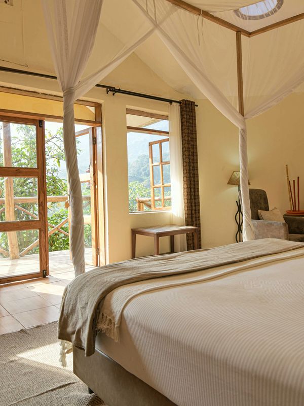Cobbled paths with wooden bannisters join the well-appointed rooms, each of which have been named after individual gorillas or gorilla tribes.